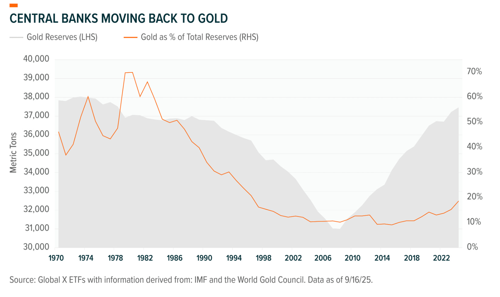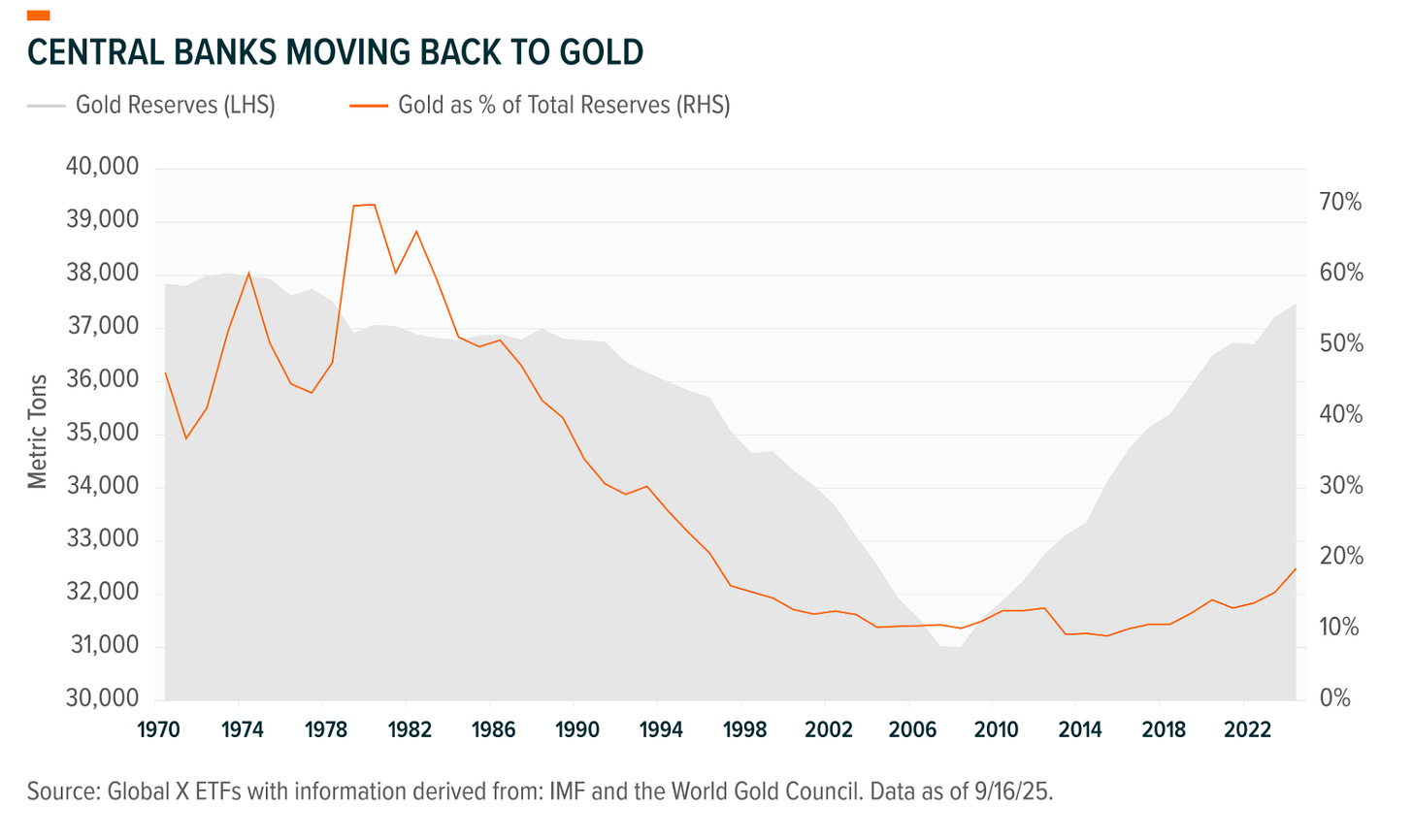 The United States moved from a gold-backed system to fiat in the early 1970s. I suspect the massive reduction in gold reserves coincided with a majority of the world implementing a similar system. The massive drop-off also coincided with a period of relative peace and prosperity. I would expect central banks to continue building their reserves for the foreseeable future, potentially reaching levels last seen in the past. This is especially true for countries that are not allied with the United States and do not trust it.