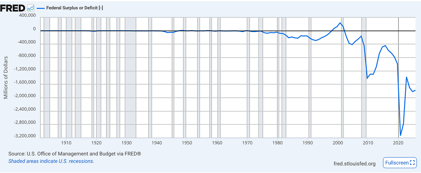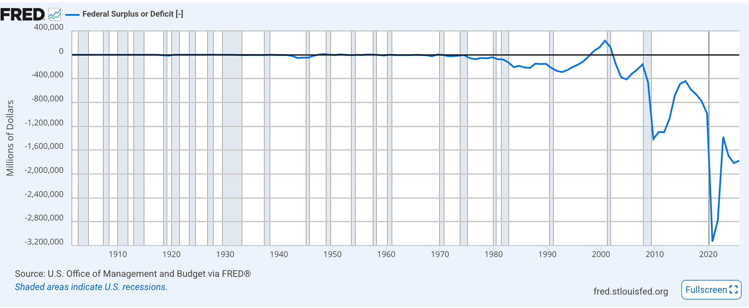 The United States went from a hundred years of fiscal responsibility, except during times of need (WWII), to regularly overspending. The United States currently spends over a trillion dollars in interest alone per annum. Current projections indicate the budget deficit will reach $2.5 trillion annually by 2035. The deficit is clearly trending worse over the last 20 years, and all indications are that this trend will continue.