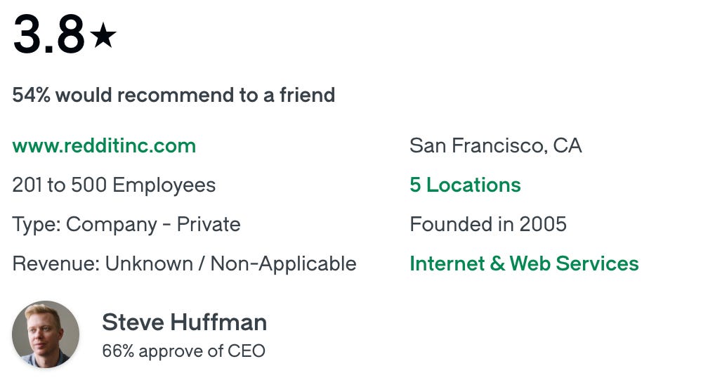 I prefer to see a slightly higher approval rating from a CEO, typically 80% or more. However, given the exceptional results, I don’t read too much into Steve Huffman’s lower approval rating. I’m also content with a Glassdoor rating of 3.8 above. It indicates that they treat their employees relatively well and that employees enjoy working on their product. I have observed a strong correlation between poor Glassdoor ratings and underperformance. See PayPal, Fiserv, and Hims for reference.