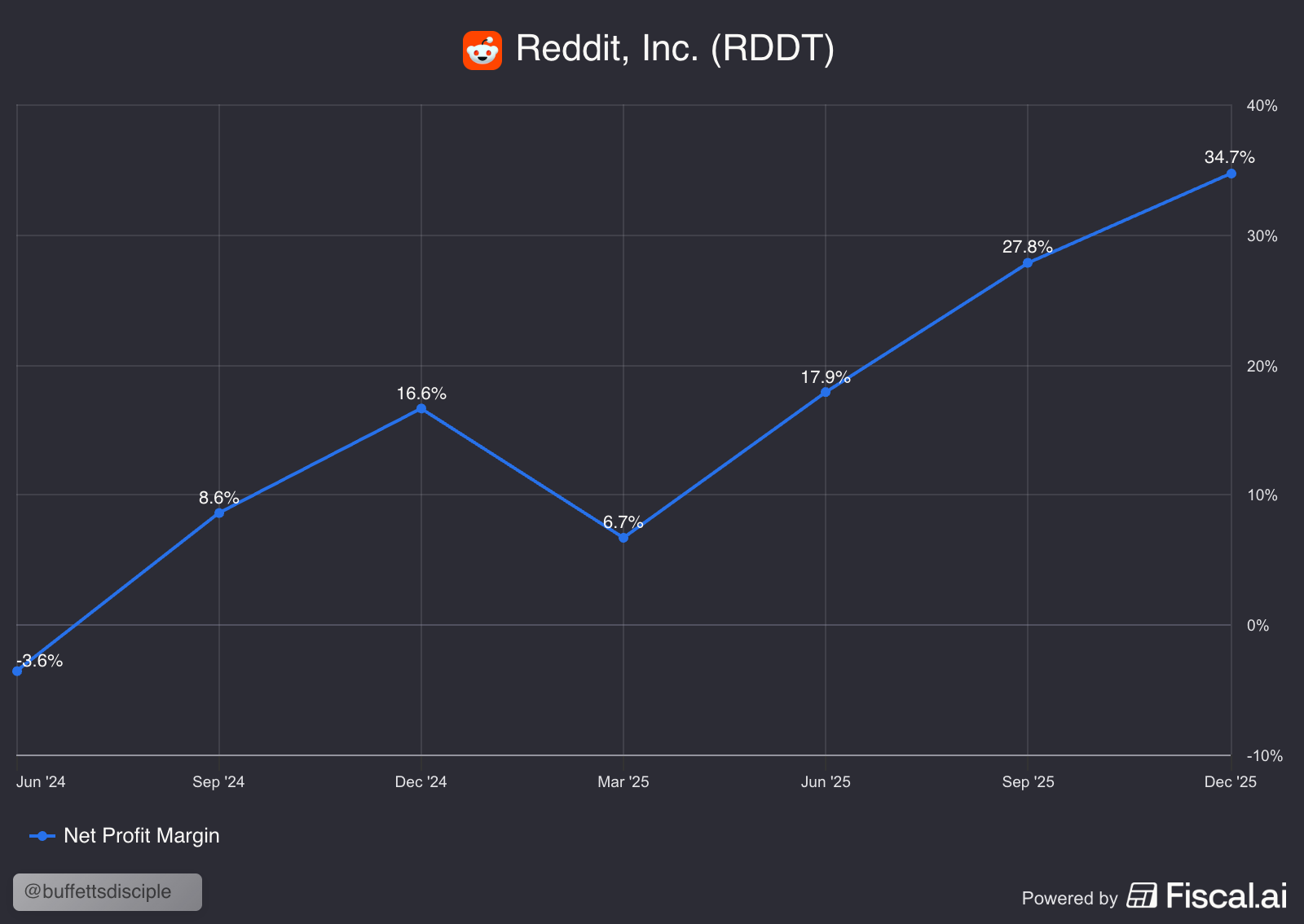 Reddit’s margins have expanded from 16.6% to 34.7% in the last 12 months, a 100% increase YoY. When using the trailing 12-month P/E, you’re including margins as low as 6.7%, which are no longer reflective of the business. This is why it’s critically important to always annualize Reddit’s numbers.