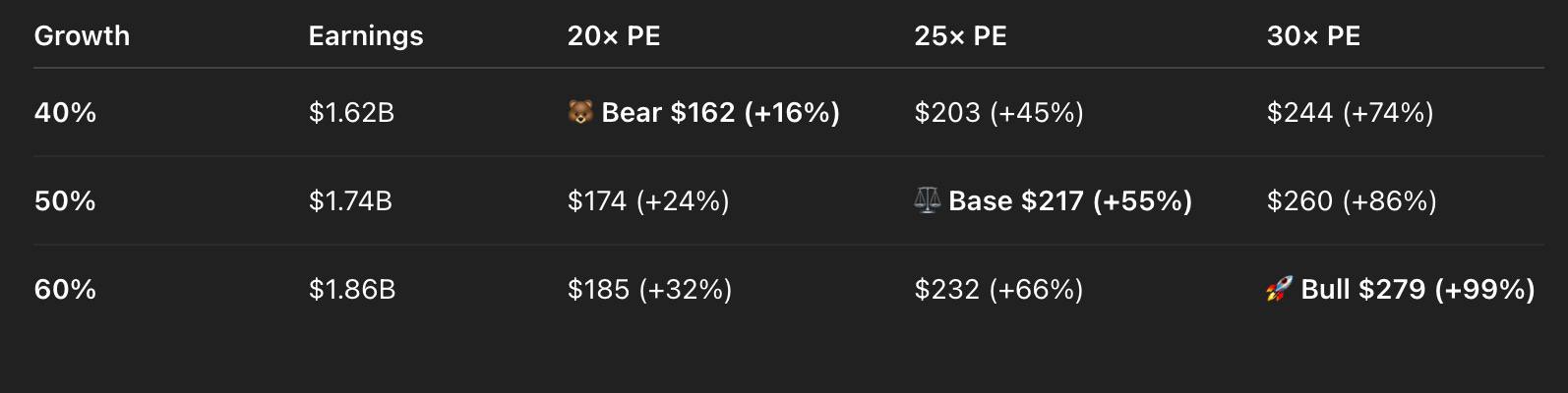 The bear case implies just 16% upside with earnings multiple compression. This would likely occur if the overall markets saw weakness. If Reddit maintains its current multiples and delivers 50% growth with some margin expansion, it would not surprise me to see the stock re-rate to roughly $220. If they outperform growth yet again and experience multiple expansions, we could see as high as $280, although I find this scenario unlikely.