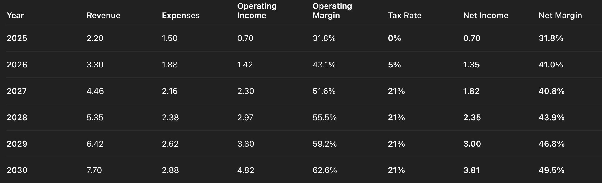 This table assumes 2025 revenue of $2.2B growing 50% in 2026, 35% in 2027, and 20% thereafter, expenses starting at $1.5B growing 25%, 15%, then 10% annually, with NOL-shielded taxes of 0% in 2025, 5% in 2026, and a normalized 21% rate thereafter.