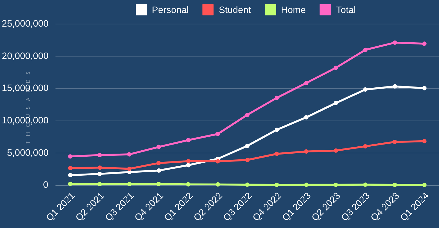 Financial services account for about 25% of SoFi's revenue currently and are their fastest-growing segment. I personally believe this is their best opportunity to diversify their revenue streams. Most impressive here is their deposit growth of $3B quarter-over-quarter to a total of $21.6B in total deposits in Q1 '24. This is good for SoFi because deposits are the cheapest form of money to lend on. As we saw above, most of their revenue comes from loans. So, what SoFi will probably do this year is build a solid deposit base, observe how their loans outstanding perform, and then, going into 2025, grow their loan portfolio consistently and responsibly. If SoFi does this well, for the first time in a long time, SoFi investors might finally see a strong return on their investment.