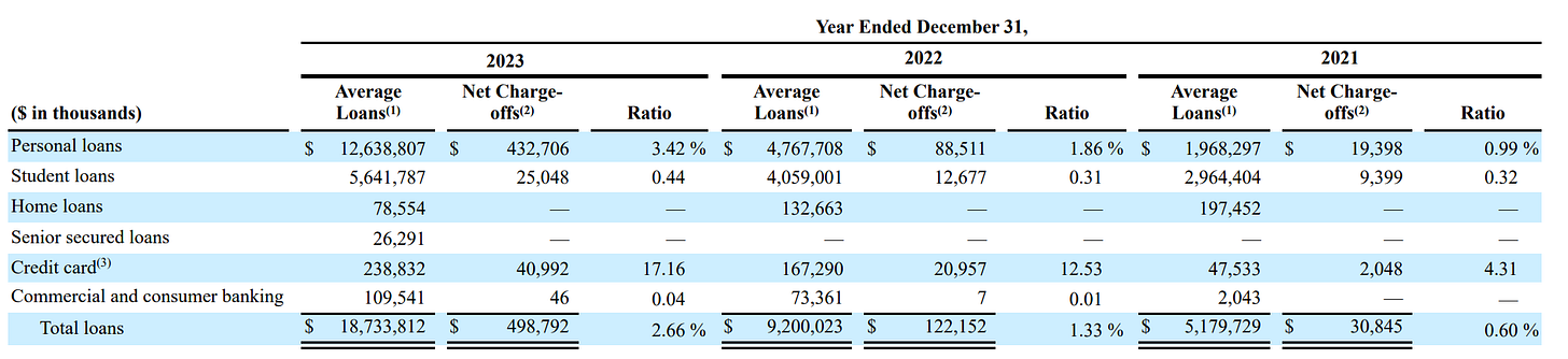 Loans make up about 50% of SoFi’s revenue right now, which is why many people refer to SoFi as a bank. A significant portion of this revenue is derived from personal loans. One advantage of personal loans is they typically have a better NIM due to the increased risk associated with them. Increased risk can yield increased profit to the bearer as long as the risk is calculated appropriately. To get a feel for the quality of these loans, we need to look at their net charge-offs.